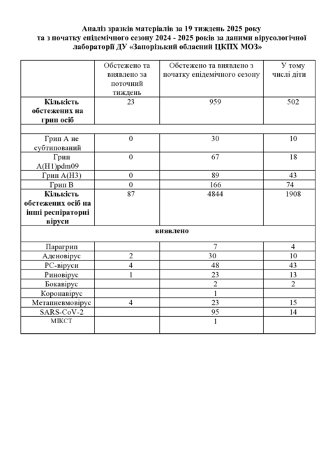 -з початку сезону станом на 20.04.2025 року підтверджена циркуляція вірусів грипу А – у 186 випадках, вірусу грипу В- у 166 випадках; також у поточному році підтверджена циркуляція вірусів парагрипу, аденовірусів, риновірусів, РС-вірусів, бокавірусу, метапневмовірусу.