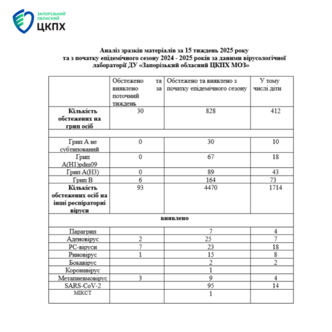 Захворюваність на ГРВІ за 15-й тиждень 2025 р. по Запорізькій області