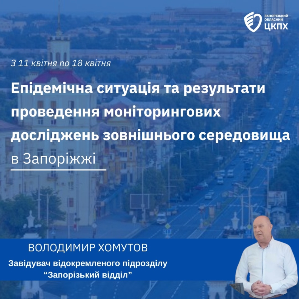 На попередньому тижні (з 11 по 18 квітня 2025 р.) фахівці Відокремленого підрозділу «Запорізький відділ» продовжували аналіз епідемічної ситуації та проведення моніторингових досліджень зовнішнього середовища в м. Запоріжжі. Ділимося результатами: