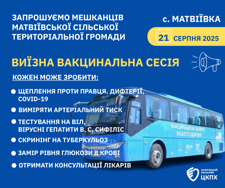 Запрошуємо мешканців Матвіївської громади взяти участь у виїзній вакцинальній сесії, яка проходитиме із залученням спеціалізованого транспорту.