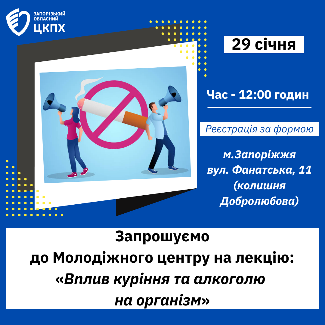 29 січня 2025 року в Молодіжному центрі за адресою: м. Запоріжжя, вул. Фанатська, буд. № 11 відбудеться лекція на тему: «Вплив куріння та алкоголю на організм».