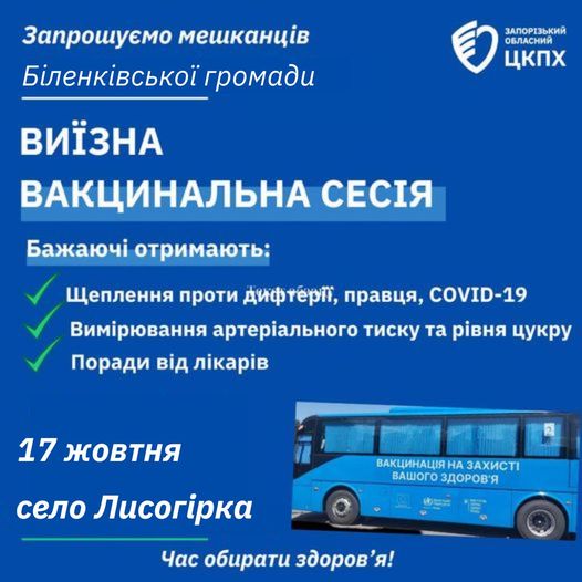 17 жовтня ми запрошуємо мешканців селища Лисогірка Белінківської громади долучитися до акції з вакцинації- «День здоров’я у громаді».