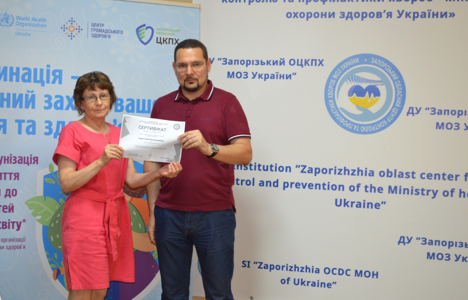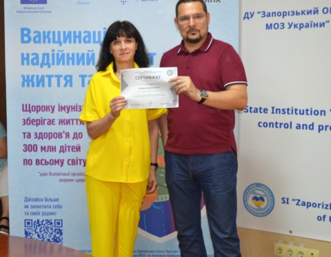 Сертифіковані тренери: завідувач відділу імунопрофілактики Запорізький обласний центр контролю та профілактики хвороб, регіональний координатор з імунізації Марина Колерова та Кирило Калашник – доцент кафедри інфекційних хвороб Запорізького державного медико-фармацевтичного університету, доктор філософії в галузі “Медицина” (PhD).