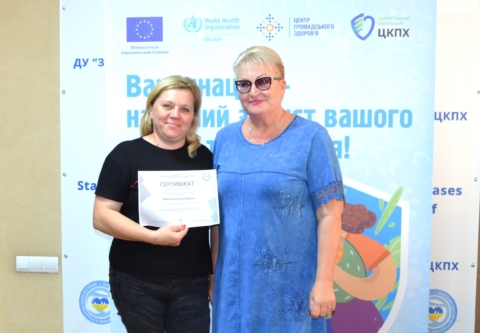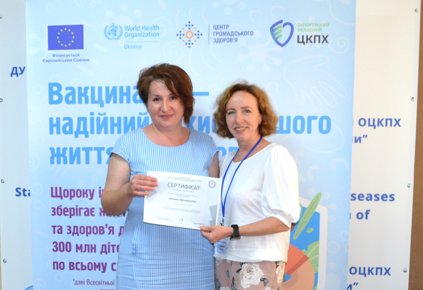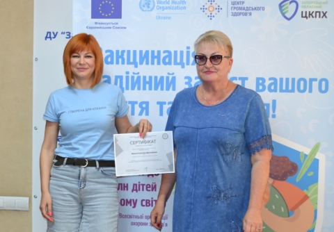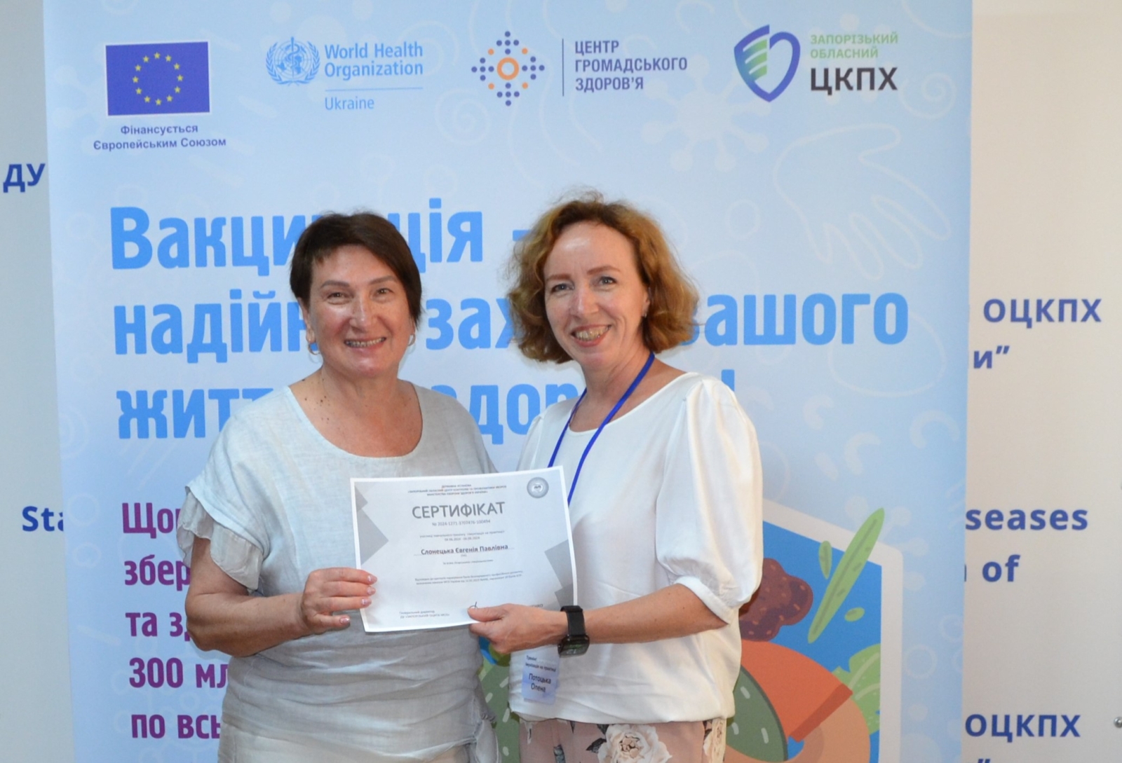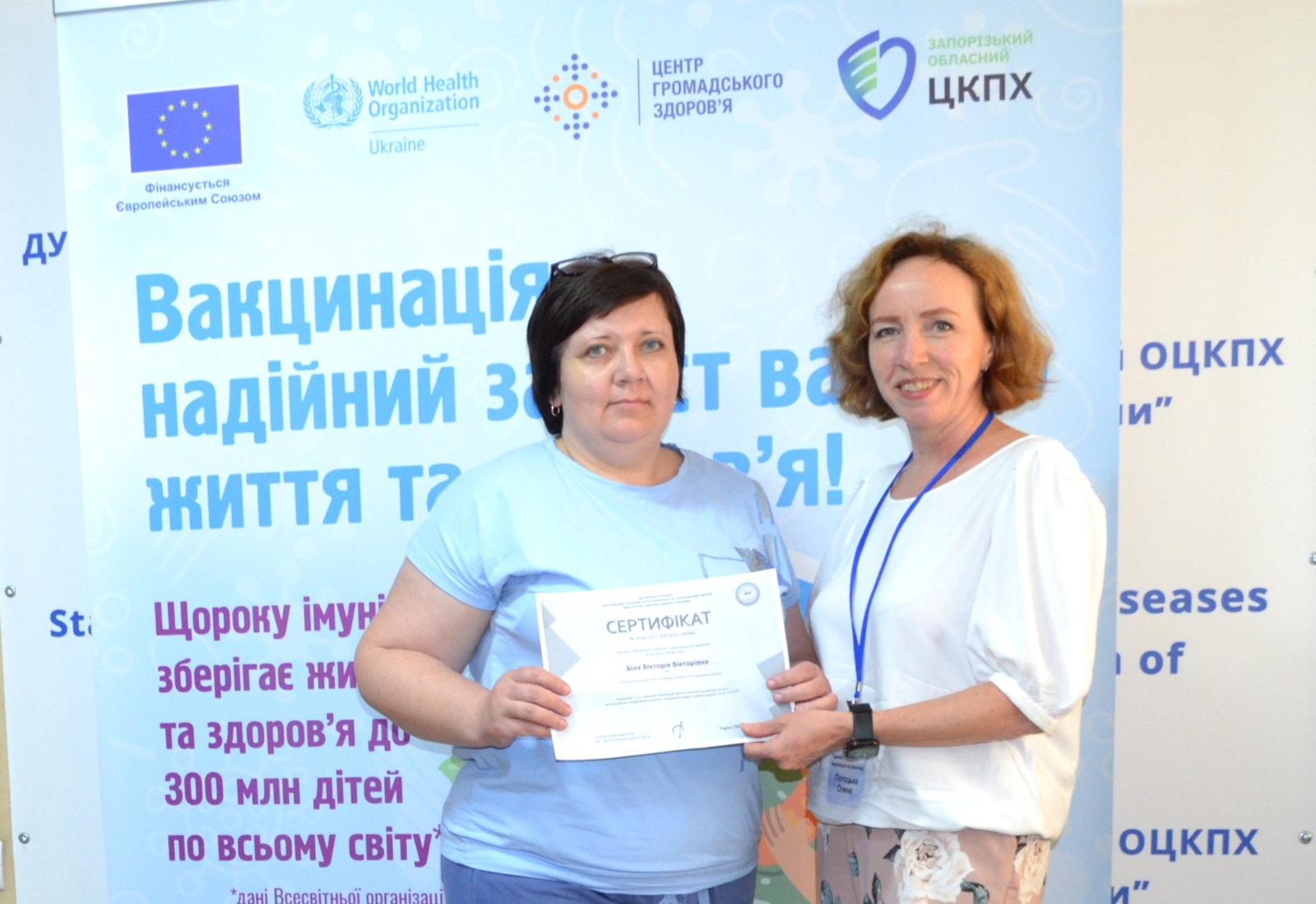 Сертифіковані тренери: завідувач відділу імунопрофілактики Запорізького ОЦКПХ, регіональний координатор з імунізації в області Марина Колерова та лікар-педіатр ЦПМСД №10 Олена Потоцька.