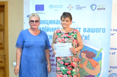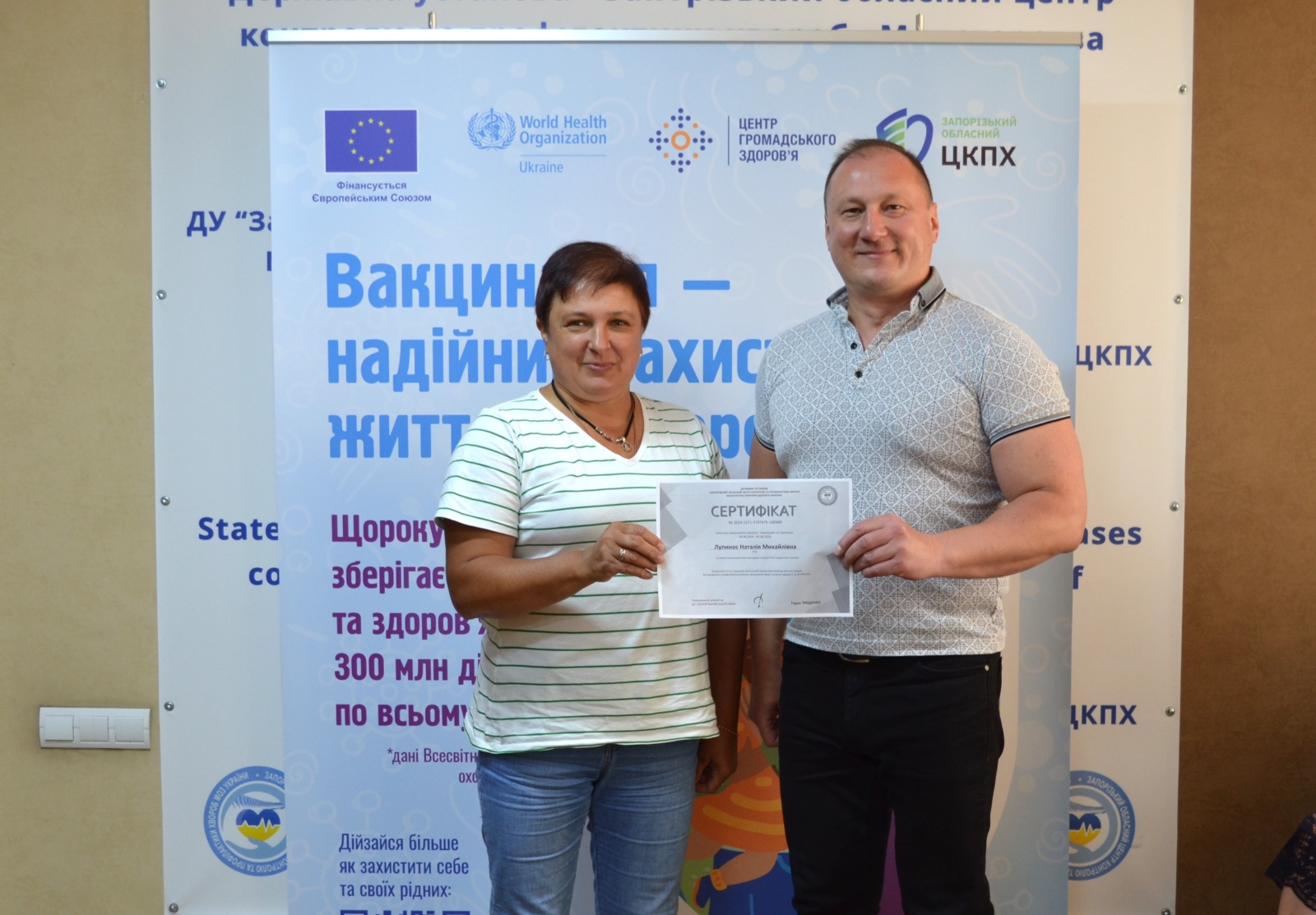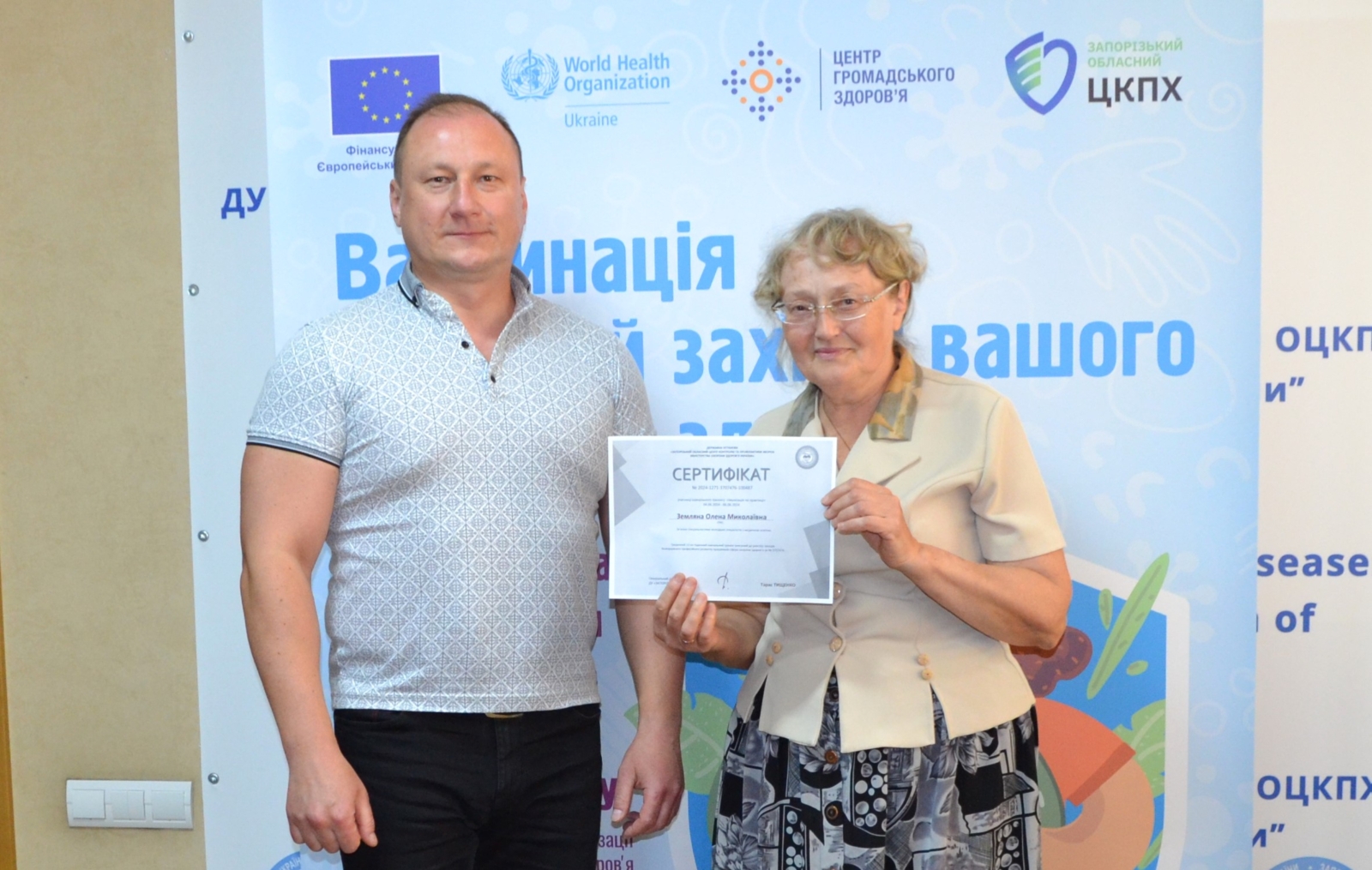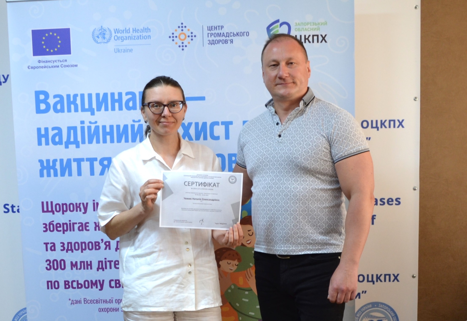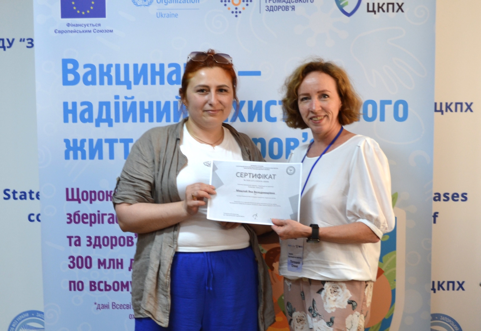 Сертифіковані тренери: завідувач відділу імунопрофілактики Запорізького ОЦКПХ, регіональний координатор з імунізації в області Марина Колерова та лікар-педіатр ЦПМСД №10 Олена Потоцька.