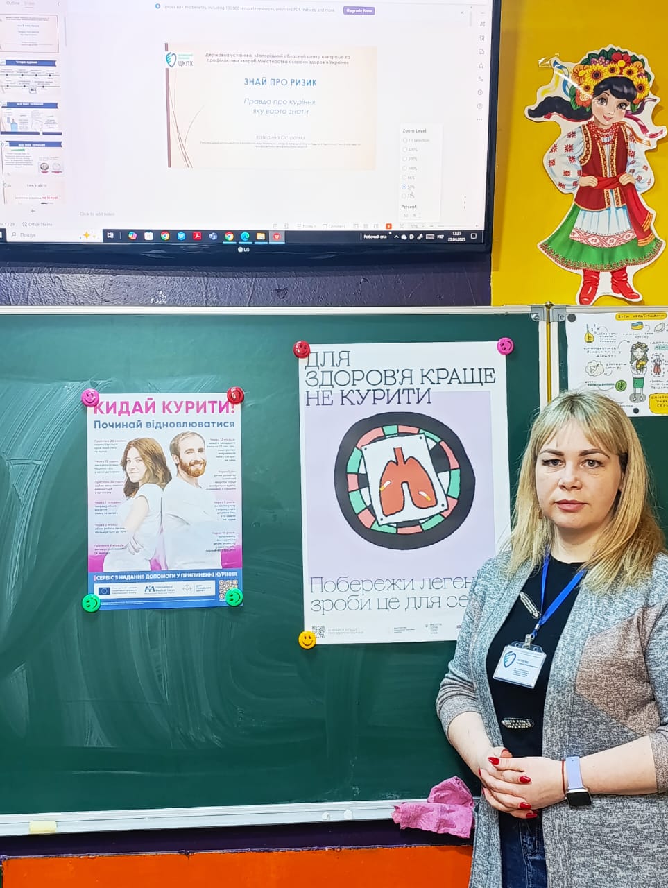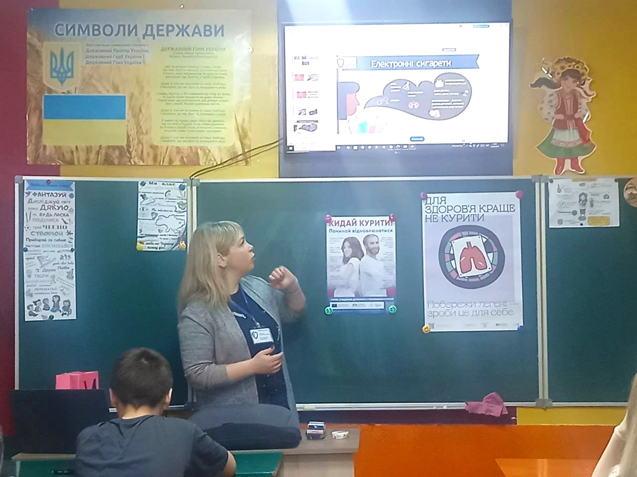 Безпечного куріння не існує! – нагадує Катерина Острогляд, лікарка з загальної гігієни відділу епідеміологічного нагляду та профілактики неінфекційних хвороб, регіональна координаторка з контролю над тютюном під час зустрічі з підлітками запорізької гімназії «Основа». Днями відбулися два інтерактивних уроки для 44 учнів 9-х та 7-х класів, школярі приєдналися в тому числі онлайн.